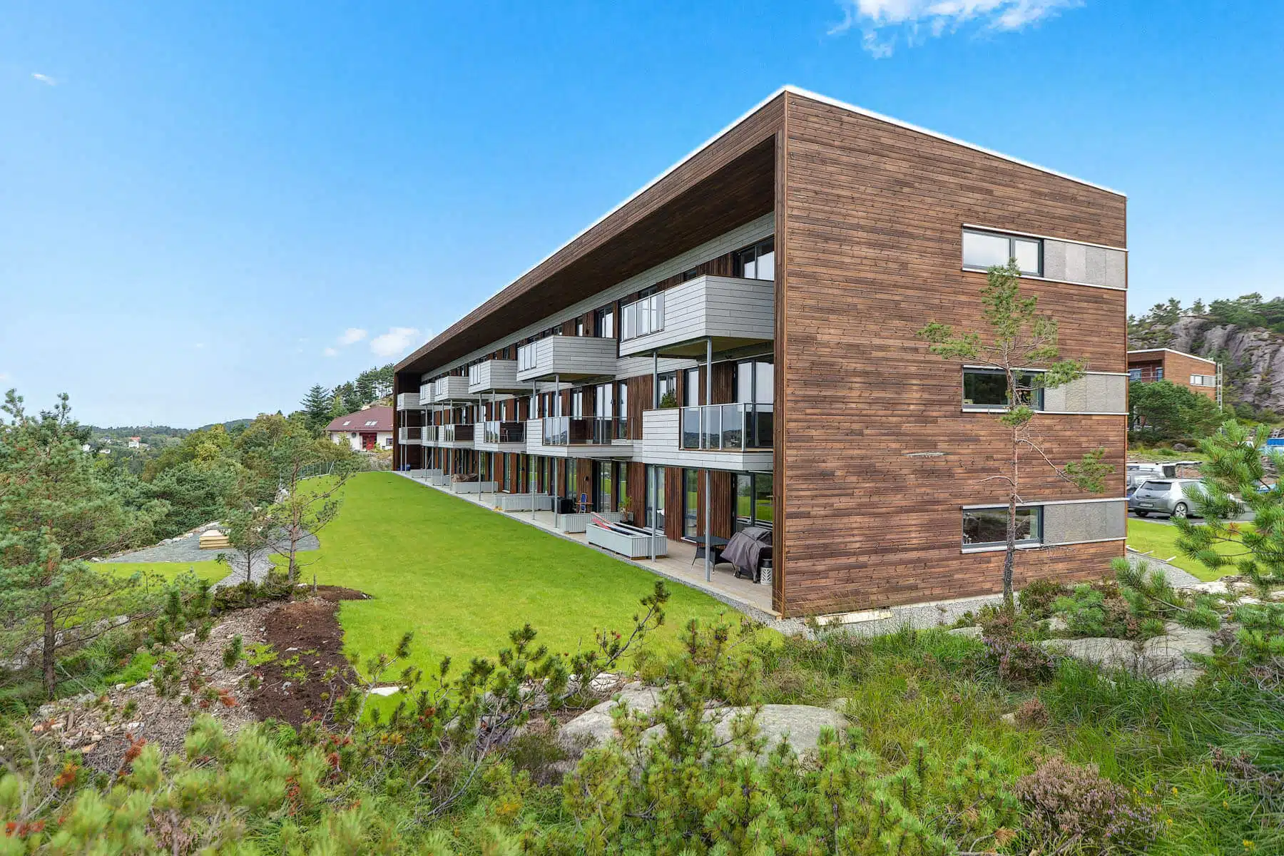 Nydelig sjøutsikt og sol til sen kveld. Byggene ligger vestvendt, høyt og fritt i terrenget.
